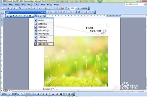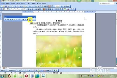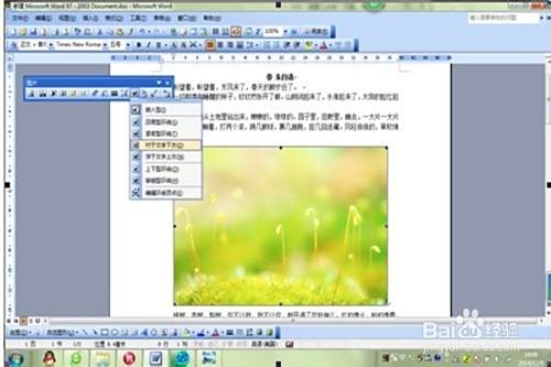 4我们打开图片之后发现图片在文字的下端,是因为图片的尺寸比较合适,所以没有遮挡住图片。如果挡住图片,我们可以拖移图片改变其大小。或者我们点击工具栏的改变图片格式改变大小。当然不改大小也是可以的,不挡住文字就好。这个其实就是最常用的环绕型效果。