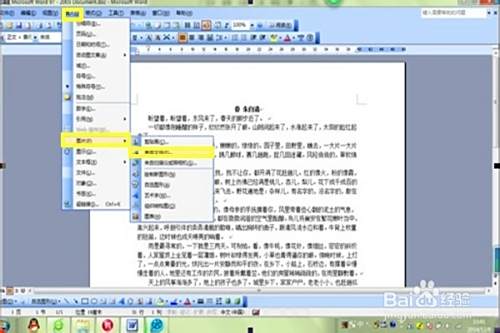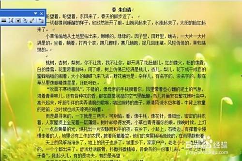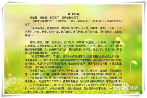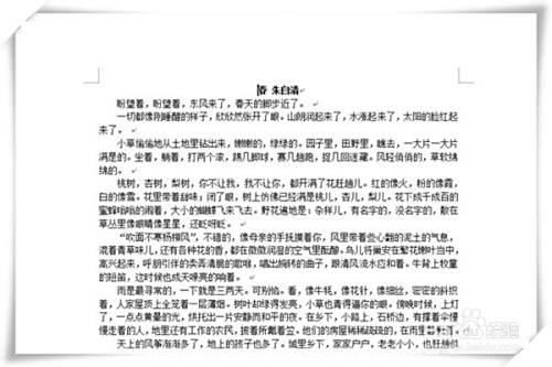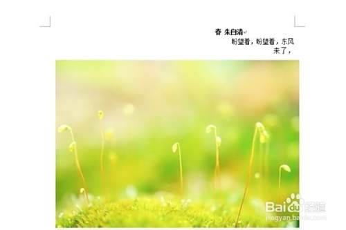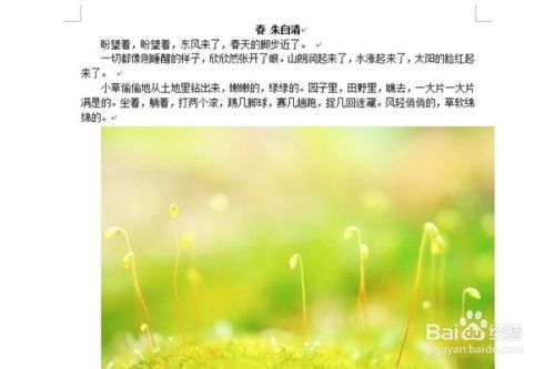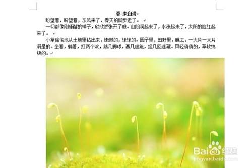 小编打开百度,我们先搜索一下散文《春》,这里小编是以这篇散文做的示范,如果你的文字不是这个也没有关系,要找自己相适应的图片。我们把这篇文字复制粘贴到word里面。打开word的效果如下图所示。小编截的图注意现在还是空白的文字,没有插过图片。
