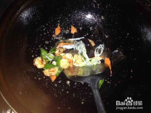 虾仁变色,加入配菜翻炒;