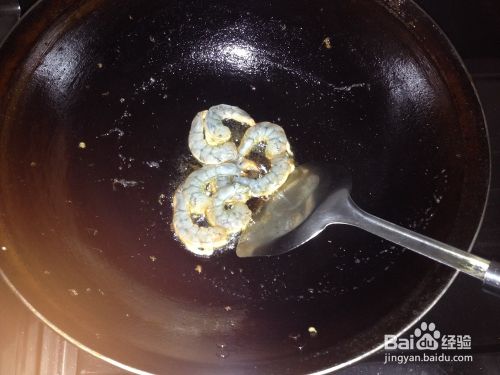 点火,锅热加食用油适量,炒虾仁;