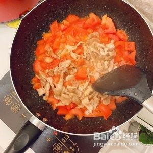 番茄炒出水就下肉进去炒,炒到融合在一起。,放盐