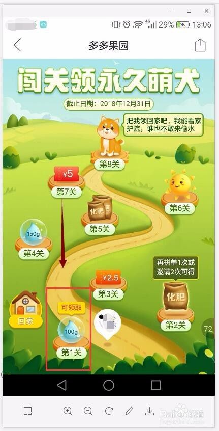 如拼单成功后,返回到活动页面中看到一步按钮上显示:可领取,点击它把第一步奖励的100g水滴领取到自己的果园水壶内。