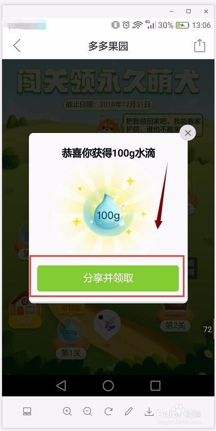 分享后,这时返回到多多果园窗口主页面后,这时会看到水壶内有一个100g水滴数量,可根据提示进行给自己的果树浇水操作。