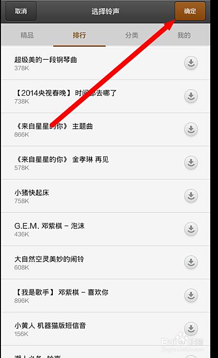 选择“手机铃声”之后就可以选择自己喜欢的歌曲,我们可以在排行中选择试听,试听满意后就可以选择,点击右上角“确定”选项就可以设置成功。