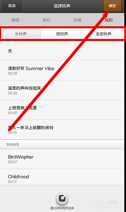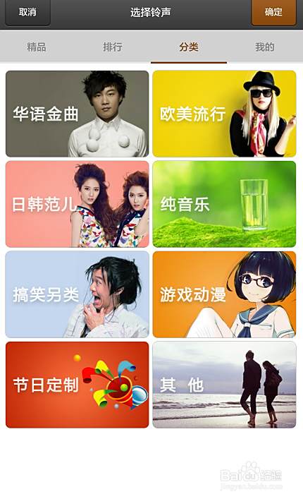 如果还是没有选择到称心如意的铃声可以在“分类”中选择自己的一种铃声风格,最后选择确定,这样就顺利设置成功了。