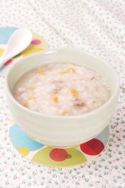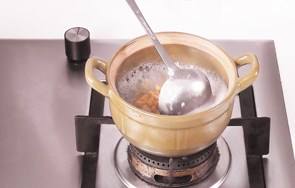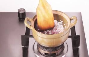 小火煮至粥变黏稠后,用勺子搅拌一下。