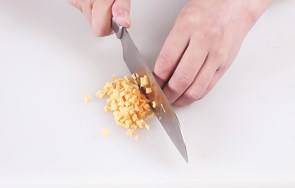 洗好的地瓜切皮后切成小粒,牛肉切小粒。