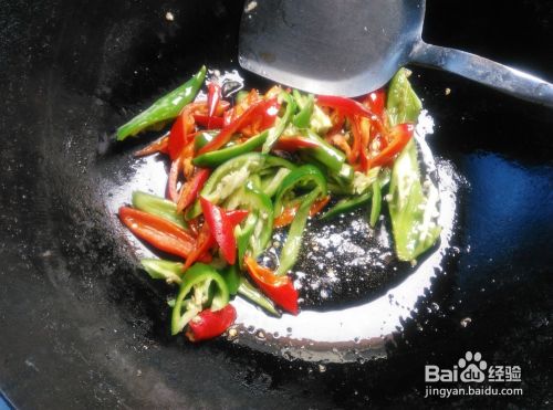 待油沸腾后,放入辣椒、大蒜,翻炒2~3翻。