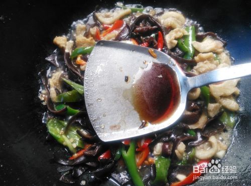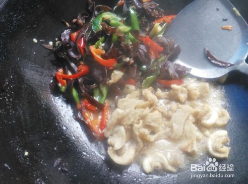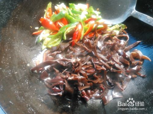 放入木耳翻炒5~6翻,让辣椒和木耳互相混合均匀。
