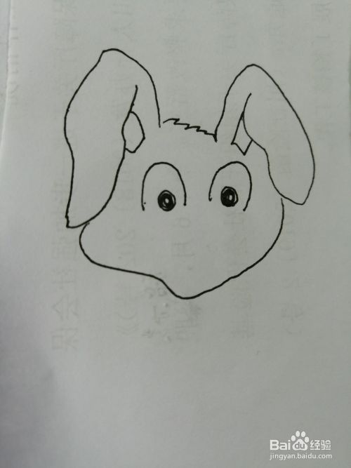 第三步,在可爱的长耳朵的小兔子椭圆形的脸上画出两个弯曲弧线和黑黑的眼珠。