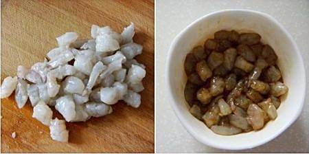 虾洗净控水,用牙签在距虾头第二节处轻轻挑出去虾线,然后剥去外壳,留下虾仁,再将虾仁冲洗干净,每条虾仁切成大概3到4小段,接着加一点料酒、生抽、盐、花椒粉腌制一会儿,去除腥味。