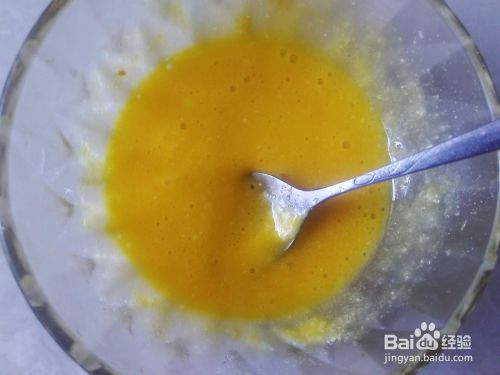蛋黄加30克的奶粉搅拌至没有颗粒为止。