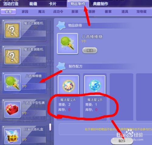 点击物品制作,找到八音棒棒糖,在你的魔法星尘个数满足的情况下,点击制作,如果没有足够的魔法新尘,可以通过魔法合成或魔法升级获得