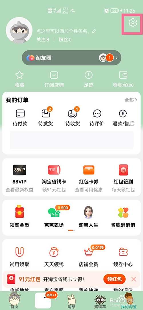 打开手机淘宝app,在“我的淘宝”界面点击右上角齿轮设置图标。