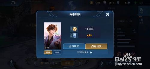 点击英雄后,到了英雄购买界面,可以看到李白这个英雄,也可以看到这个英雄所需要的金币和点劵。