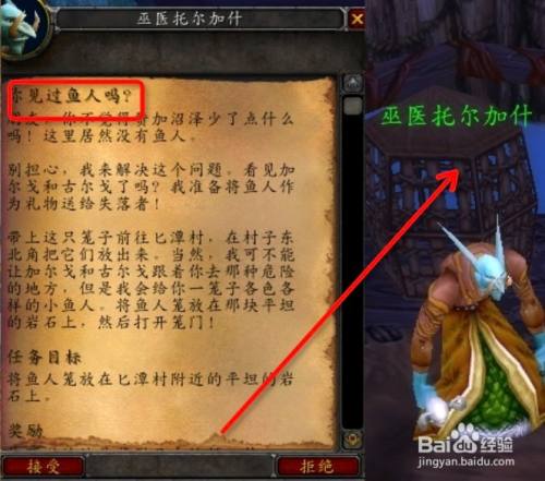第二步:然后找到NPC巫医托尔加什并交谈,接取你见过鱼人吗任务。