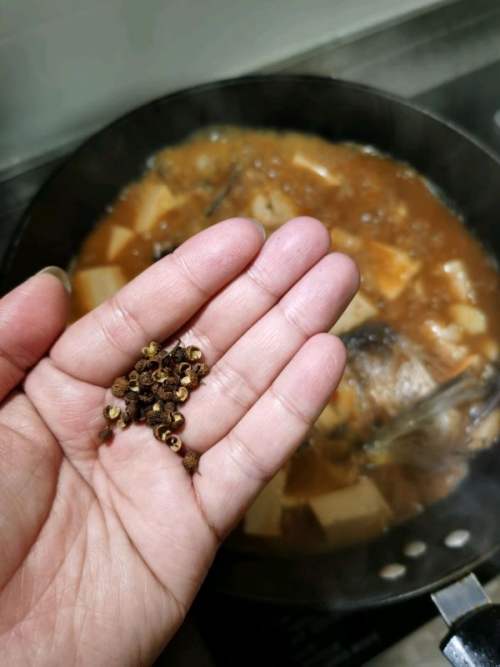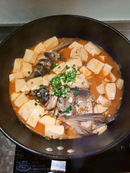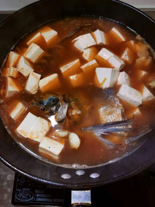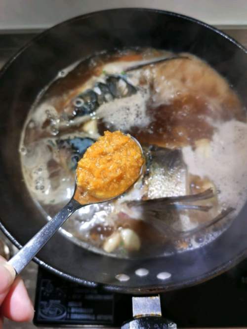 6鱼头煎到局部微焦即可放入热水,没过鱼头。两勺生抽、一勺蒸鱼豉油、一勺红辣椒酱和两勺黄灯笼辣椒酱(提鲜去腥)