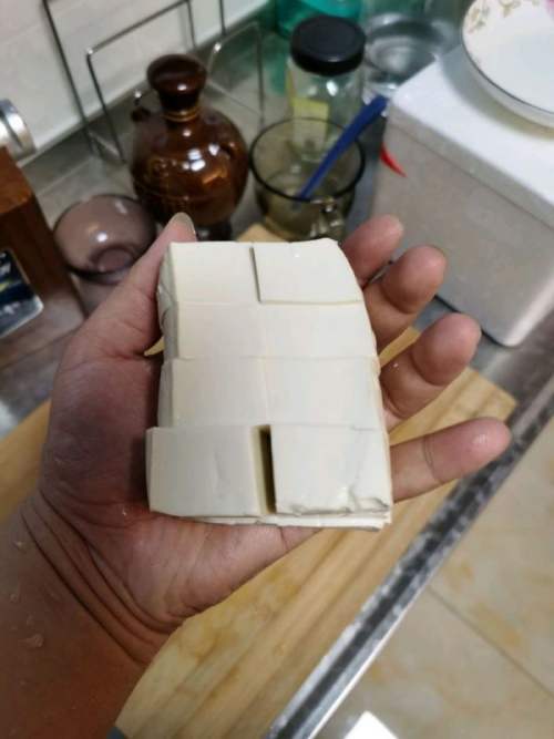 4嫩豆腐切块(不熟练的话不要在手上切)