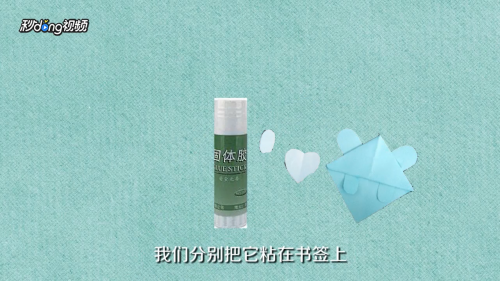 用剪刀剪一个心形和一个椭圆形粘到书签上。
