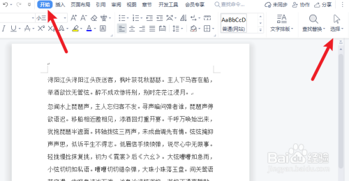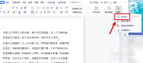 打开电脑上的WPS文件,打开开始下面的选择功能,点击全选就可以全选全文。