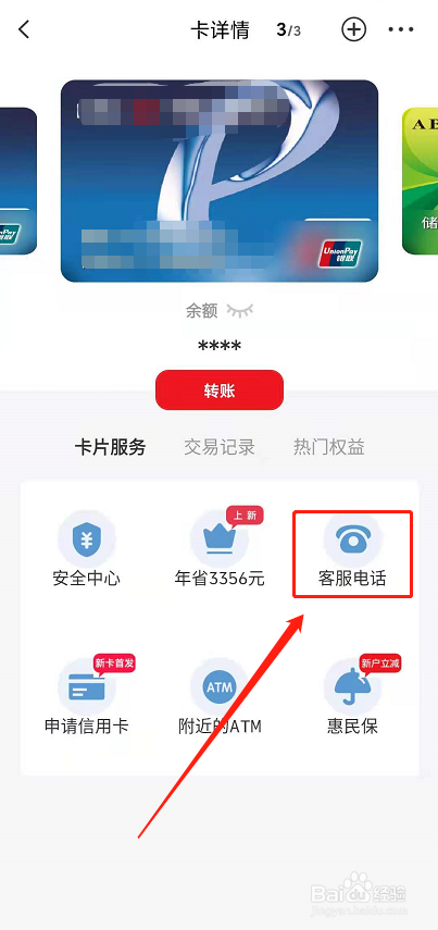 页面弹出相应的客服电话,点击拨号键,拨打客服电话,提供姓名、身份证号,就可以查看到完整的卡号了。
