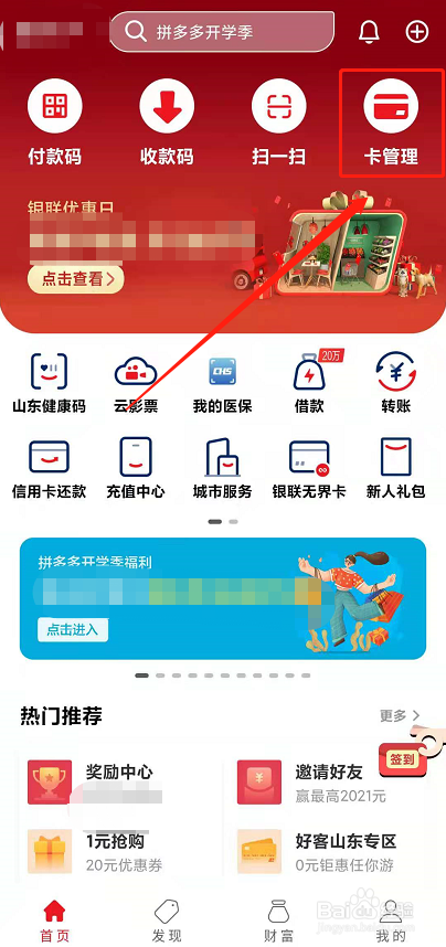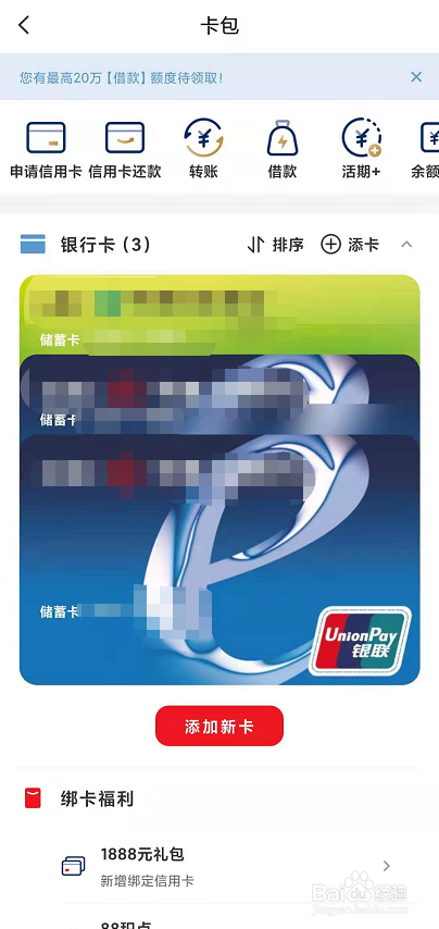 点击后卡开卡包列表,找到并点击需要查看卡号的银行卡。