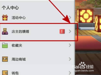 点击头像后,出现了一些导航栏,我们可以很清楚的看见有一个【店主的馈赠】,就是他发出的感叹号,我们点进去。