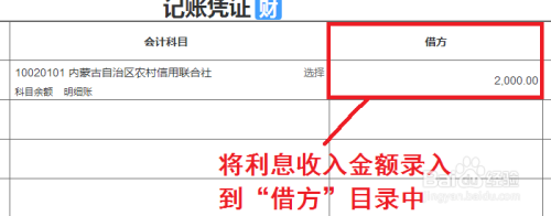 ②选择分录后,将所得银行存款利息所得录入在借方目录中。