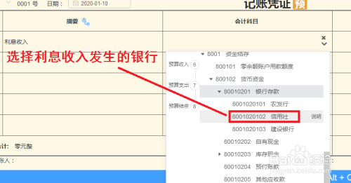 ① 同样在凭证分录中寻找利息收入发生的银行信息,作者这边的做账系统选择的为8001020102—内蒙古农村信用联合社。