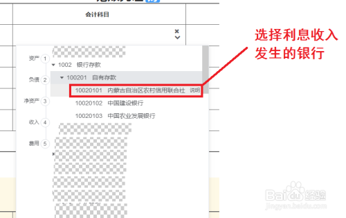 ①在凭证分录中寻找利息收入发生的银行信息,作者这边的做账系统选择的为10020101—内蒙古农村信用联合社。