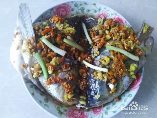 把蒸熟的鱼头拿出来,再把鱼头里面多余的汤倒出来,然后撒上香葱白。