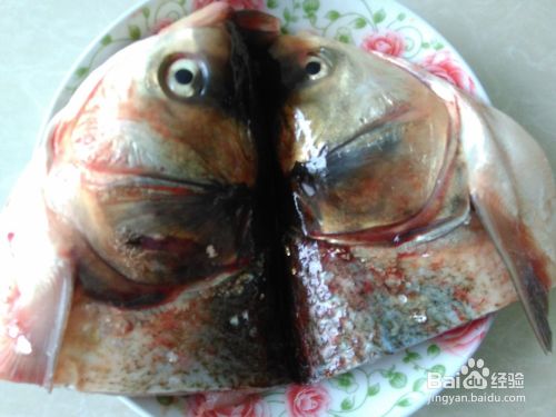 首先把鱼头清理干净,然后破开成两半,摆到碟中。