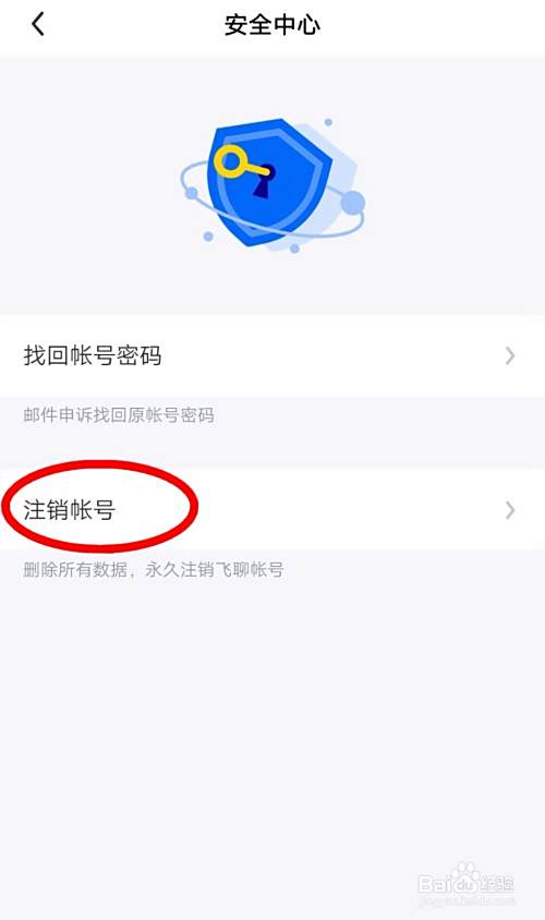 在安全中心点击注销账户(永久删除数据,注销飞聊账号),如下图!