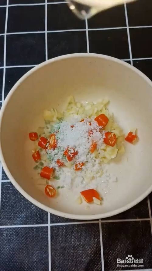 小碗中放入蒜末和小米椒,再放入鸡精盐白糖等调味品,再放入一勺辣椒油,搅拌均匀。