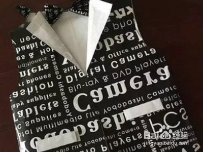 接下来把领口那一部分折成西服领口的样子,在环保袋上找一块纸将它折成蝴蝶结的样子固定好。
