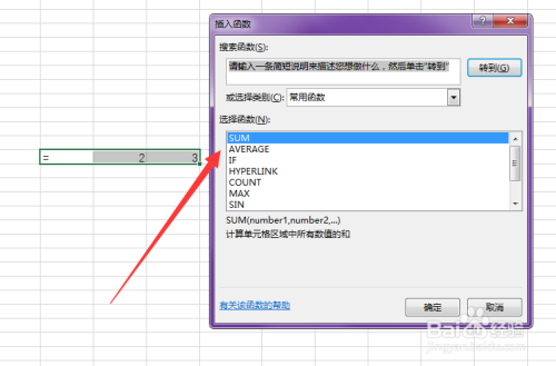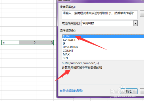 在选中函数中有很多函数,大家可以选中一个函数下面就会出现这个函数的释义,第1个就是相加了;