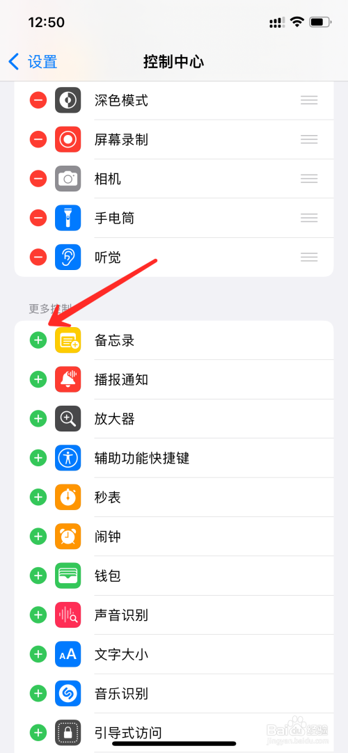 在更多控制功能里,点击选择想要添加的快捷功能前面的+图标。