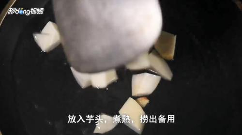 3在锅中倒入适量清水,烧开,放入芋头,煮熟,捞出备用。将葱切段,在热锅倒入少许油,烧热,加入葱段炒香。