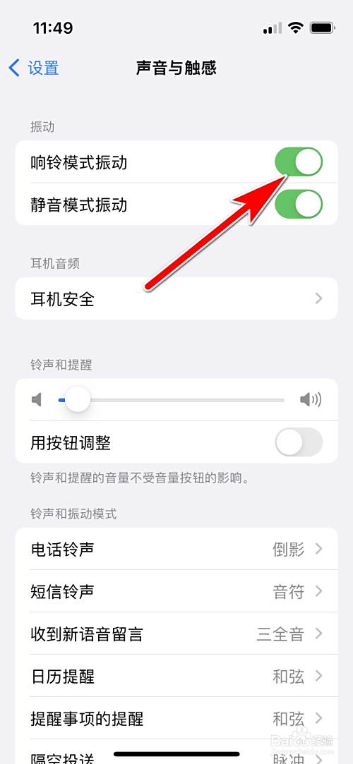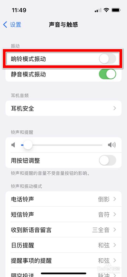 点击响铃模式振动的功能右边的按钮。