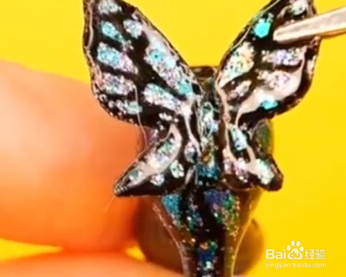 再用热熔胶做一个高跟鞋的跟,去两个蝴蝶翅膀的闪片,用黑色指甲油涂出纹路。