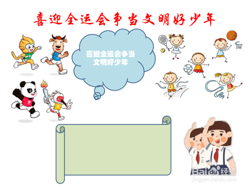 然后在中间内容框里写上“喜迎全运会争当文明好少年”,