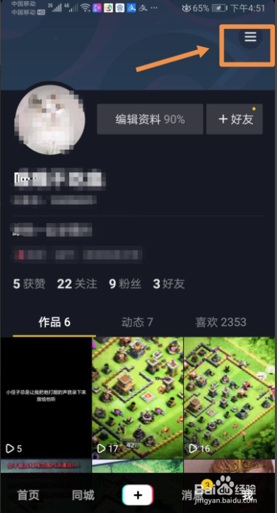 二步,进入“我”的界面后,点击右上角的三个横线图标。