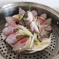将腌制好的鱼放入蒸锅中,开水上屉,大火蒸7分钟。此时不要把锅盖拿下来,再虚蒸3分钟。