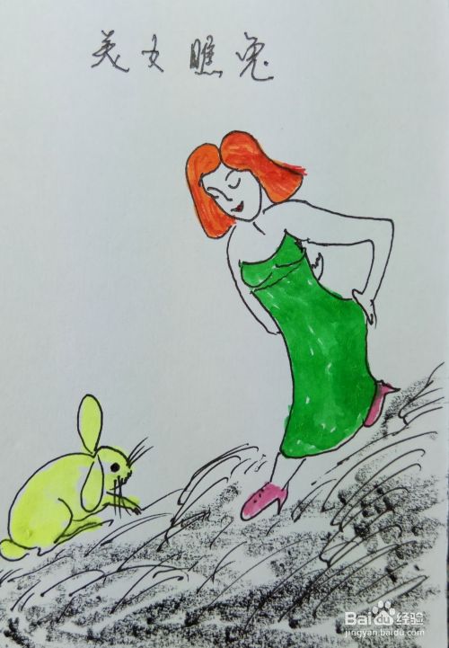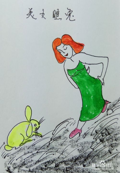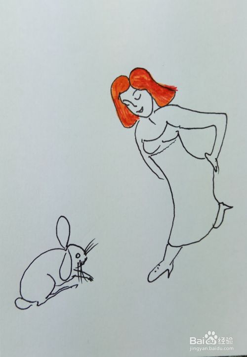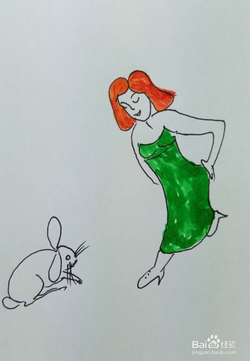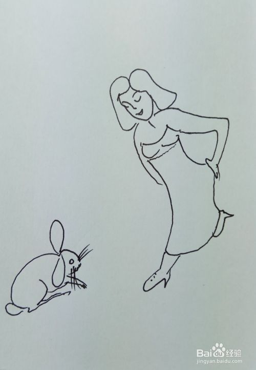 再画出她的腿和脚,并画出一个小兔子的外形轮廓,这个美女正在看兔子呢。