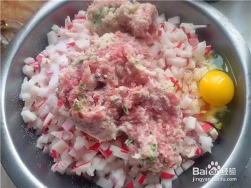 把萝卜丁放在盆里,再加上肉馅和一个鸡蛋,肉馅的量也可以根据个人需要来调节。