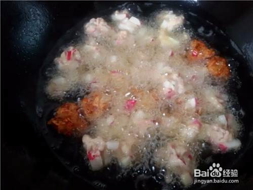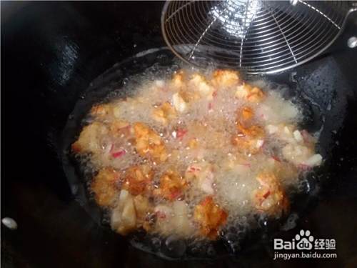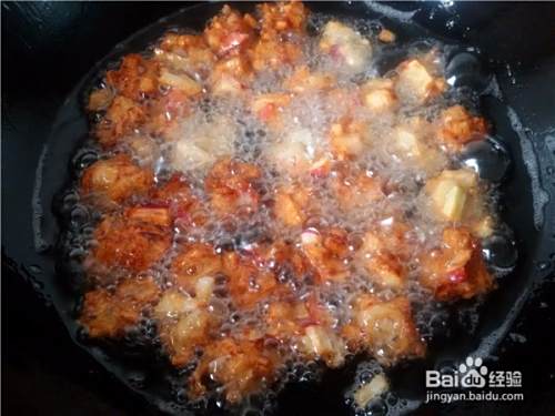 锅中倒入适量的油,烧至五成热,用勺子舀或是用手的虎口挤出丸子放在油锅里炸。