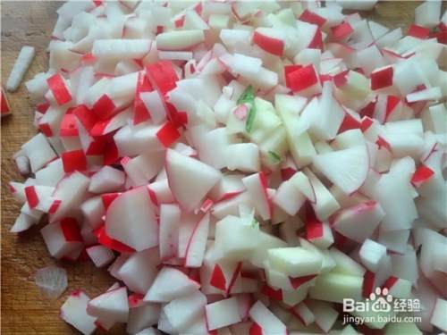 把萝卜切成小丁,有的人会选择刨成丝,切丁脆,切丝更软,可以根据自己的爱好来选择。