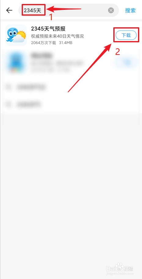 接下来,在搜索框中输入“2345天”后,接着点击搜索列表中“2345天气预报”右侧的“下载”按钮进行下载。见下图