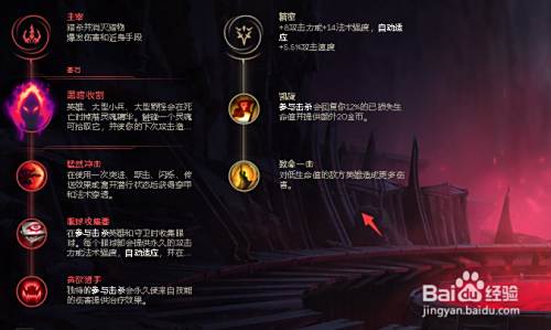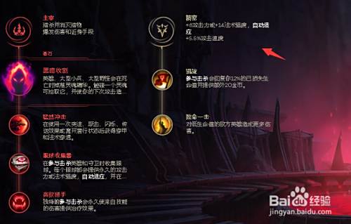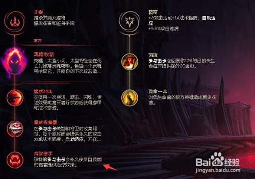 第二栏选择致命一击,对敌生命值的敌方英雄造成更多伤害,配合凯旋,增加了生存能力。