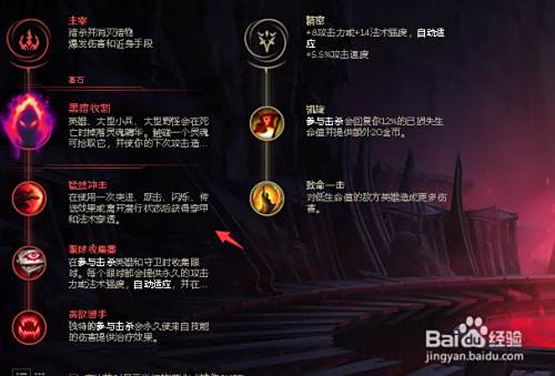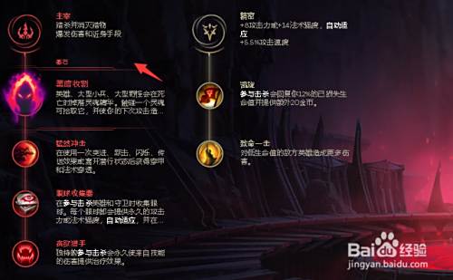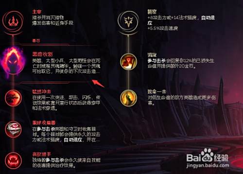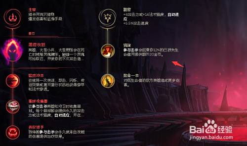 第一栏选择凯旋,参与击杀回复12%的已损失生命值并且提供额外的20金币,增加了生存能力。
